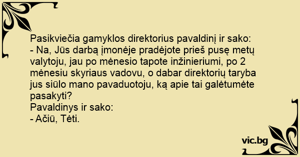 Pasikviečia gamyklos direktorius pavaldinį ir sako: