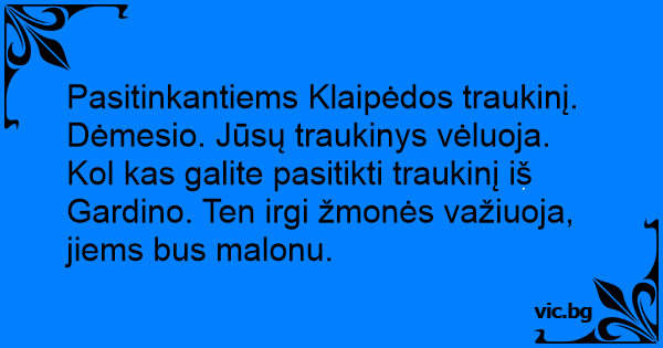 Pasitinkantiems Klaipėdos traukinį. Dėmesio. Jūsų traukinys vėluoja. Kol kas galite pasitikti traukinį iš Gardino. Ten irgi žmonės važiuoja, jiems bus malonu.