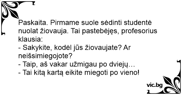 Paskaita. Pirmame suole sėdinti studentė nuolat žiovauja. Tai pastebėjęs, profesorius klausia: