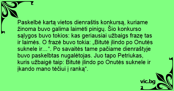 Paskelbė kartą vietos dienraštis konkursą, kuriame žinoma buvo galima laimėti pinigų. Šio konkurso sąlygos buvo tokios: kas geriausiai užbaigs frazę tas ir laimės. O frazė buvo tokia: „Bitutė įlindo po Onutės suknele ir…“. Po savaitės tame pačiame dienraštyje buvo paskelbtas nugalėtojas. Juo tapo Petriukas, kuris užbaigė taip: Bitutė įlindo po Onutės suknele ir įkando mano tėčiui į ranką“.