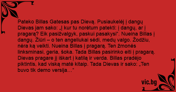 Pateko Billas Gatesas pas Dievą. Pusiaukelėj į dangų Dievas jam sako: „Į kur tu norėtum patekti: į dangų, ar į pragarą? Eik pasižvalgyk, paskui pasakysi“. Nueina Billas į dangų. Žiūri – o ten angeliukai sėdi, medų valgo. Žodžiu, nėra ką veikti. Nueina Billas į pragarą. Ten žmonės linksminasi, geria, šoka. Tada Billas pasirinko eiti į pragarą. Dievas pragare jį iškart į katilą ir verda. Billas pradėjo piktintis, kad viską matė kitaip. Tada Dievas ir sako: „Ten buvo tik demo versija…“