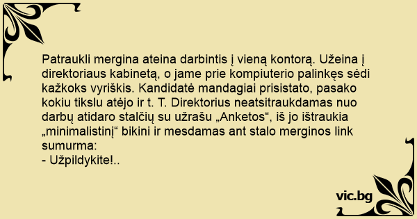 Patraukli mergina ateina darbintis į vieną kontorą. Užeina į direktoriaus kabinetą, o jame prie kompiuterio palinkęs sėdi kažkoks vyriškis. Kandidatė mandagiai prisistato, pasako kokiu tikslu atėjo ir t. T. Direktorius neatsitraukdamas nuo darbų atidaro stalčių su užrašu „Anketos“, iš jo ištraukia „minimalistinį“ bikini ir mesdamas ant stalo merginos link sumurma: