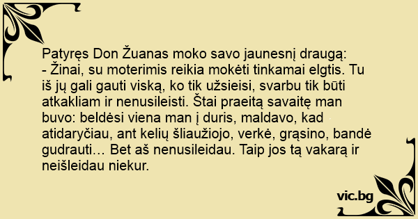 - Žinai, su moterimis reikia mokėti tinkamai elgtis. Tu iš jų gali gauti viską, ko tik užsieisi, svarbu tik būti atkakliam ir nenusileisti. Štai praeitą savaitę man buvo: beldėsi viena man į duris, maldavo, kad atidaryčiau, ant kelių šliaužiojo, verkė, grąsino, bandė gudrauti… Bet aš nenusileidau. Taip jos tą vakarą ir neišleidau niekur.