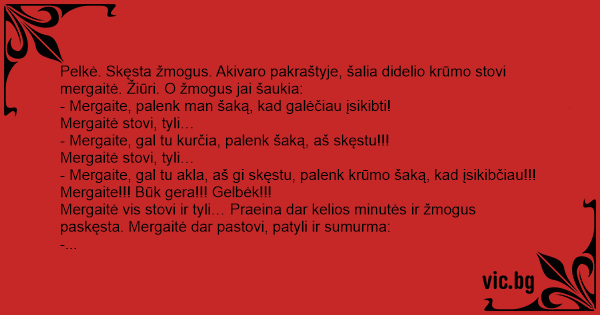 - Mergaite, gal tu akla, aš gi skęstu, palenk krūmo šaką, kad įsikibčiau!!! Mergaite!!! Būk gera!!! Gelbėk!!!