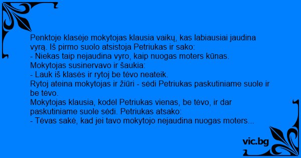 Penktoje klasėje mokytojas klausia vaikų, kas labiausiai jaudina vyrą. Iš pirmo suolo atsistoja Petriukas ir sako: