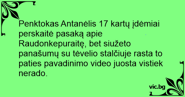 Penktokas Antanėlis 17 kartų įdėmiai perskaitė pasaką apie Raudonkepuraitę, bet siužeto panašumų su tėvelio stalčiuje rasta to paties pavadinimo video juosta vistiek nerado.