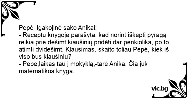 - Receptų knygoje parašyta, kad norint iškepti pyragą reikia prie dešimt kiaušinių pridėti dar penkiolika, po to atimti dvidešimt. Klausimas,-skaito toliau Pepė,-kiek iš viso bus kiaušinių?