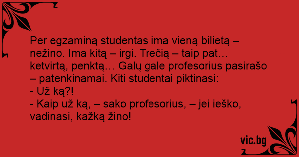 Per egzaminą studentas ima vieną bilietą – nežino. Ima kitą – irgi. Trečią – taip pat… ketvirtą, penktą… Galų gale profesorius pasirašo – patenkinamai. Kiti studentai piktinasi: