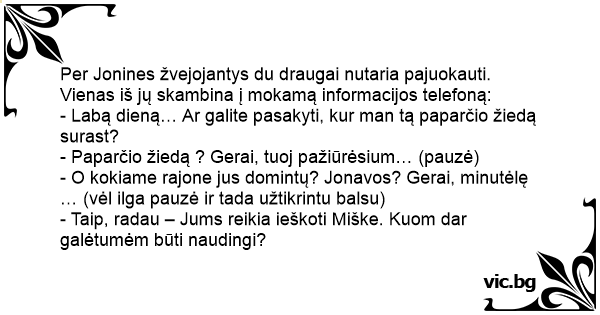 Per Jonines žvejojantys du draugai nutaria pajuokauti. Vienas iš jų skambina į mokamą informacijos telefoną: