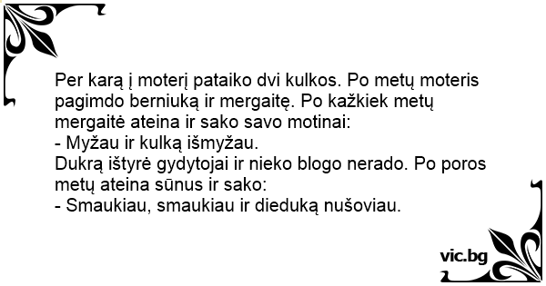 Per karą į moterį pataiko dvi kulkos. Po metų moteris pagimdo berniuką ir mergaitę. Po kažkiek metų mergaitė ateina ir sako savo motinai:
