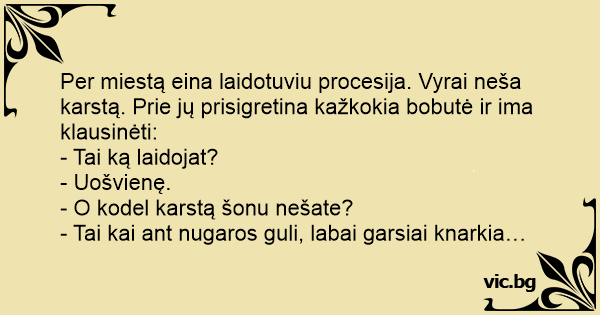 Per miestą eina laidotuviu procesija. Vyrai neša karstą. Prie jų prisigretina kažkokia bobutė ir ima klausinėti:
