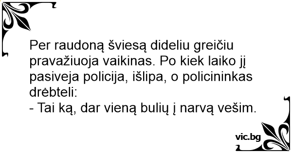 Per raudoną šviesą dideliu greičiu pravažiuoja vaikinas. Po kiek laiko jį pasiveja policija, išlipa, o policininkas drėbteli: