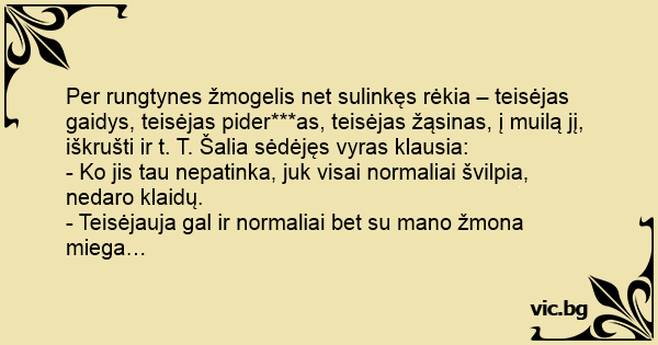 Per rungtynes žmogelis net sulinkęs rėkia – teisėjas gaidys, teisėjas pider***as, teisėjas žąsinas, į muilą jį, iškrušti ir t. T. Šalia sėdėjęs vyras klausia: