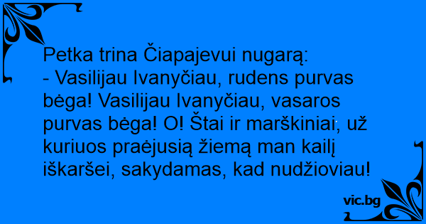 - Vasilijau Ivanyčiau, rudens purvas bėga! Vasilijau Ivanyčiau, vasaros purvas bėga! O! Štai ir marškiniai, už kuriuos praėjusią žiemą man kailį iškaršei, sakydamas, kad nudžioviau!