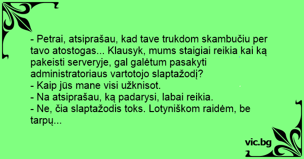 - Petrai, atsiprašau, kad tave trukdom skambučiu per tavo atostogas... Klausyk, mums staigiai reikia kai ką pakeisti serveryje, gal galėtum pasakyti administratoriaus vartotojo slaptažodį?