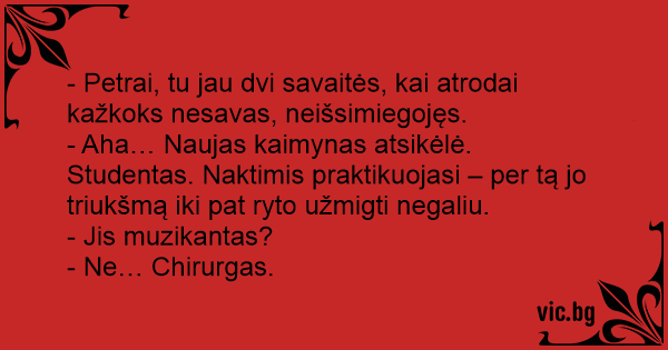 - Aha… Naujas kaimynas atsikėlė. Studentas. Naktimis praktikuojasi – per tą jo triukšmą iki pat ryto užmigti negaliu.