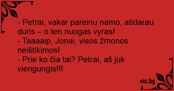 - Petrai, vakar pareinu namo, atidarau duris – o ten nuogas vyras!