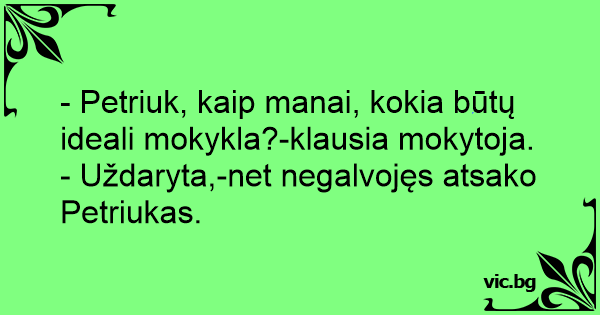 - Petriuk, kaip manai, kokia būtų ideali mokykla?-klausia mokytoja.
