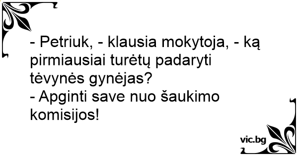 - Petriuk, - klausia mokytoja, - ką pirmiausiai turėtų padaryti tėvynės gynėjas?