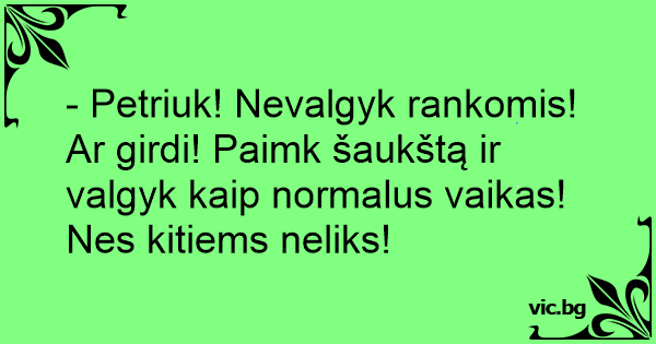 - Petriuk! Nevalgyk rankomis! Ar girdi! Paimk šaukštą ir valgyk kaip normalus vaikas! Nes kitiems neliks!