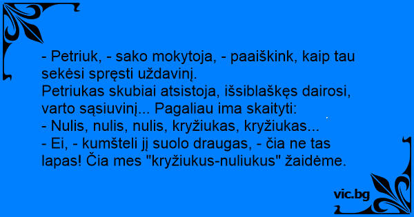 - Ei, - kumšteli jį suolo draugas, - čia ne tas lapas! Čia mes "kryžiukus-nuliukus" žaidėme.