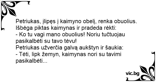 Petriukas, įlipęs į kaimyno obelį, renka obuolius. Išbėga piktas kaimynas ir pradeda rėkti: