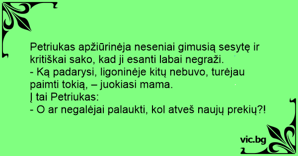 Petriukas apžiūrinėja neseniai gimusią sesytę ir kritiškai sako, kad ji esanti labai negraži.