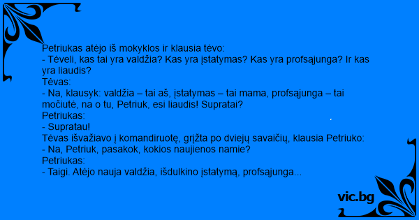 - Na, klausyk: valdžia – tai aš, įstatymas – tai mama, profsąjunga – tai močiutė, na o tu, Petriuk, esi liaudis! Supratai?