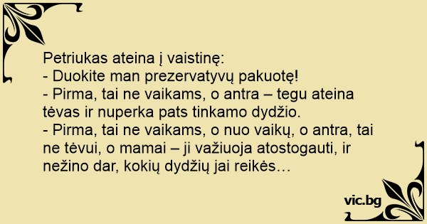 Кондоми Вовочка приходит в аптеку: Влиза Иванчо в аптеката: Przychodzi mały Jasio do apteki i mówi do aptekarza: - Proszę mi dać coś do zapobiegania ciąży. Aptekarz się zdenerwował i reprymenduje Jasia: - Po pierwsze - to o takim czymś mówi się szeptem, a nie na cały głos. - Po drugie - to nie jest dla dzieci. - Po trzecie - niech ojciec sobie sam... Die kleine Renate kommt in die überfüllte Drogerie, bleibt an der Tür stehen und ruft laut: "Bitte drei Dutzend Kondome in verschiedenen Größen." Alles ist starr. Der Drogist fängt sich am... O garoto chega à farmácia e fala: — Seu Joaquim, minha mãe pediu pra o senhor mandar cinco caixas de camisinhas. — Qual o tamanho. — Sei não. — Então vá perguntar. Pouco depois, o garoto volta. —... Une jeune fille entre dans une pharmacie. - Je voudrais une douzaine de préservatifs, s'il vous plaît. - Qu'elle taille ? demande le pharmacien. - Faites-moi un assortiment, c'est pour aller à une... Tibike a patikában: - Csókolom, kérek szépen 3 db óvszert különböző méretekben! - Először is, az nem gyereknek való. Másodszor: jöjjön érte apukád, mert ő tudja, milyen méretre van szüksége! -...