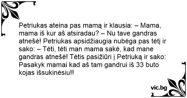 Petriukas ateina pas mamą ir klausia: – Mama, mama iš kur aš atsiradau? – Nu tave gandras atnešė! Petriukas apsidžiaugia nubėga pas tėtį ir sako: – Tėti, tėti man mama sakė, kad mane gandras atnešė! Tėtis pasižiūri į Petriuką ir sako: Pasakyk mamai kad aš tam gandrui iš 33 buto kojas išsukinėsiu!!