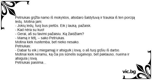 - Dabar tu eik į miegamąjį ir atsigulk į lovą, o aš tuoj grįšiu iš darbo.