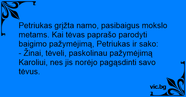 - Žinai, tėveli, paskolinau pažymėjimą Karoliui, nes jis norėjo pagąsdinti savo tėvus.