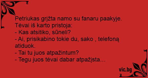 Petriukas grįžta namo su fanaru paakyje. Tėvai iš karto pristoja: