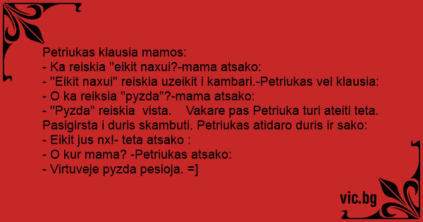 - ''Eikit naxui'' reiskia uzeikit i kambari.-Petriukas vel klausia: