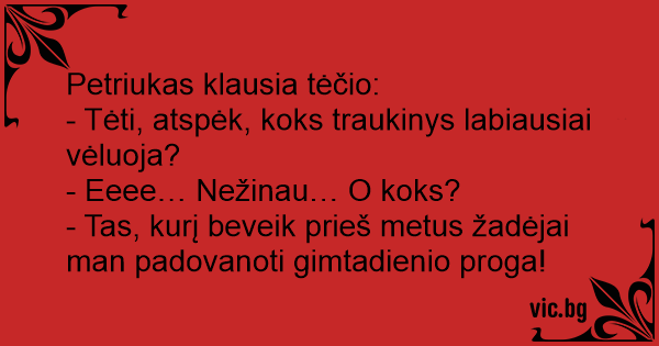 - Tėti, atspėk, koks traukinys labiausiai vėluoja?