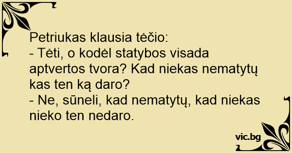 - Tėti, o kodėl statybos visada aptvertos tvora? Kad niekas nematytų kas ten ką daro?
