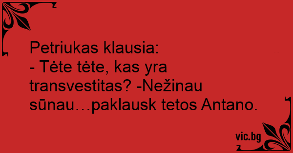 - Tėte tėte, kas yra transvestitas? -Nežinau sūnau…paklausk tetos Antano.