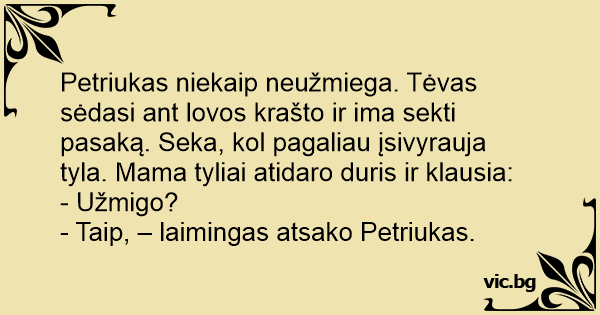 Petriukas niekaip neužmiega. Tėvas sėdasi ant lovos krašto ir ima sekti pasaką. Seka, kol pagaliau įsivyrauja tyla. Mama tyliai atidaro duris ir klausia: