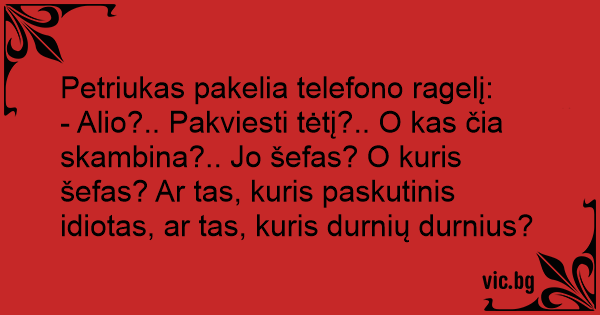- Alio?.. Pakviesti tėtį?.. O kas čia skambina?.. Jo šefas? O kuris šefas? Ar tas, kuris paskutinis idiotas, ar tas, kuris durnių durnius?