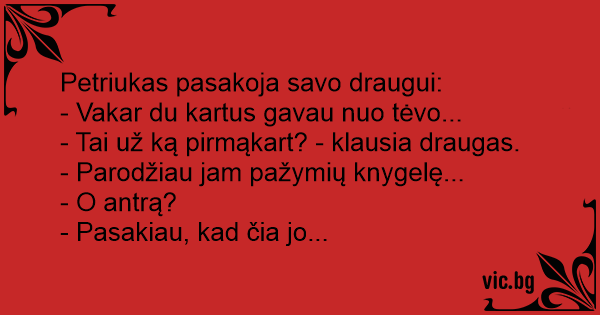 Малиот Трпе му раскажува на Цветко: - Вчера тато ме тепаше два пати! - А зошто два пати? - Првиот пат ме тепаше кога му ја покажав книшката полна со единици, а вториот пат кога сфати дека тоа е неговата книшка кога одел во школо…