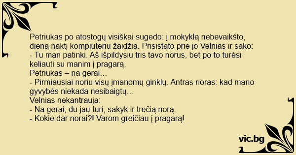 Petriukas po atostogų visiškai sugedo: į mokyklą nebevaikšto, dieną naktį kompiuteriu žaidžia. Prisistato prie jo Velnias ir sako: