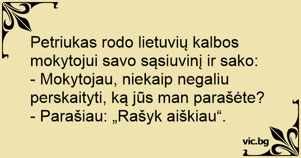 Petriukas rodo lietuvių kalbos mokytojui savo sąsiuvinį ir sako: