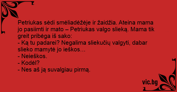 Petriukas sėdi smėliadėžėje ir žaidžia. Ateina mama jo pasiimti ir mato – Petriukas valgo slieką. Mama tik greit pribėga iš sako:
