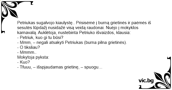 Petriukas sugalvojo kiaulystę.. Prisisėmė į burną grietinės ir paėmės iš sesutės lūpdažį nusidažė visą veidą raudonai. Nuėjo į mokyklos karnavalą. Auklėtoja, nustebinta Petriuko išvaizdos, klausia: