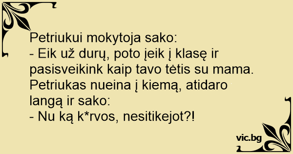 - Eik už durų, poto įeik į klasę ir pasisveikink kaip tavo tėtis su mama.