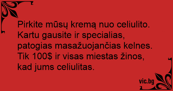 Pirkite mūsų kremą nuo celiulito. Kartu gausite ir specialias, patogias masažuojančias kelnes. Tik 100$ ir visas miestas žinos, kad jums celiulitas.
