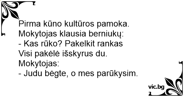 Pirma kūno kultūros pamoka. Mokytojas klausia berniukų: