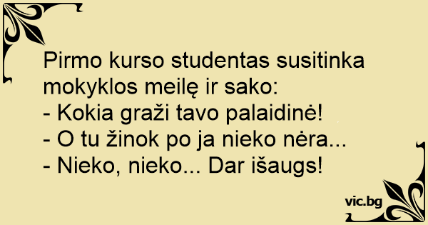 Pirmo kurso studentas susitinka mokyklos meilę ir sako: