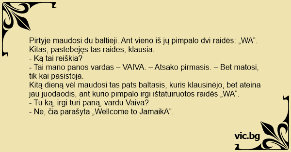 Pirtyje maudosi du baltieji. Ant vieno iš jų pimpalo dvi raidės: „WA“. Kitas, pastebėjęs tas raides, klausia: