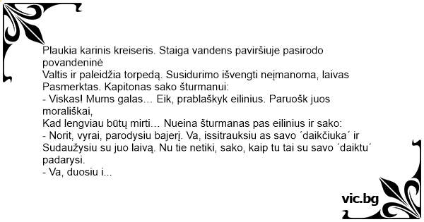 Nu ką darys vyrai – sukirto lazybų, o šturmanas išsitrauke savo daikčiuka ir dave i bortą. Pasigirdo sprogimas ir kreiseris pradėjo skęsti.